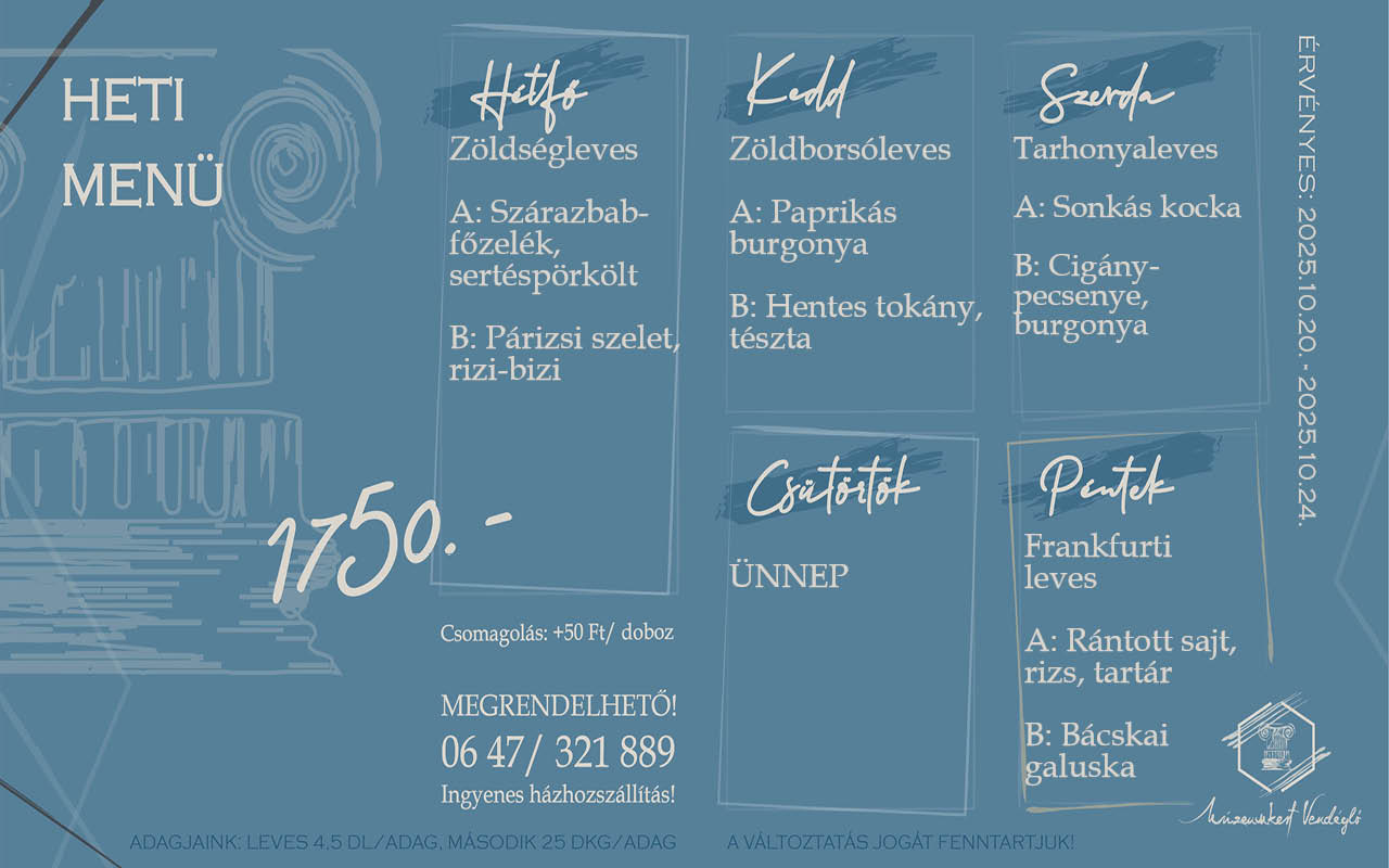 Finom ételeinket meg is rendelhetik kedves vendégeink! AKTUÁLIS NYITVATARTÁSRÓL ÉRDEKLŐDÉS, RENDELÉS, ASZTALFOGLALÁS a 47/321-889-es telefonszámon lehetséges!