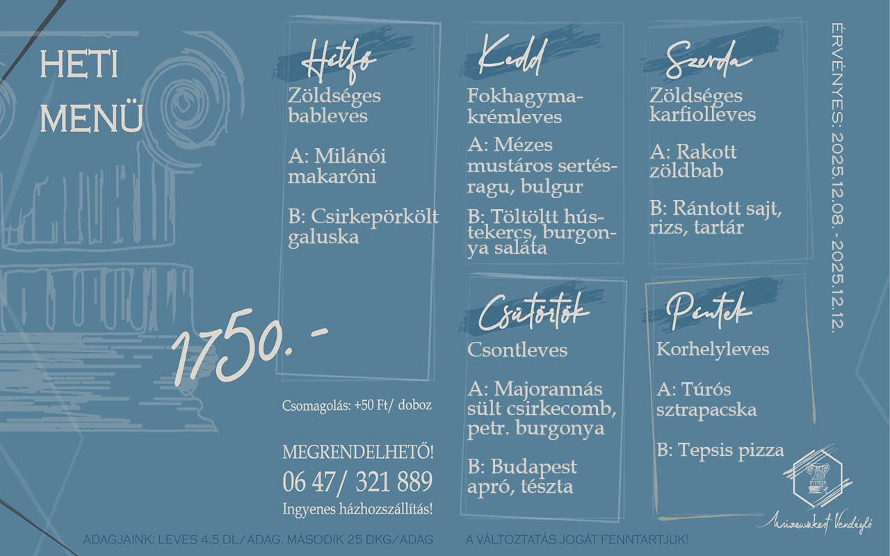 Finom ételeinket meg is rendelhetik kedves vendégeink! AKTUÁLIS NYITVATARTÁSRÓL ÉRDEKLŐDÉS, RENDELÉS, ASZTALFOGLALÁS a 47/321-889-es telefonszámon lehetséges!